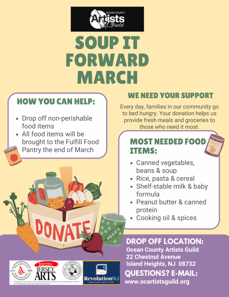 Drop off non-perishable food items at OCAG throughout March. All collected donations will be delivered to Fulfill Food Pantry at the end of the month. Donations can be dropped off at Ocean County Artists Guild during normal business hours.