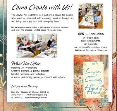 Your support makes a tangible difference: Consider a donation of $50, $100, $500 or more to help continue our beloved Ocean County Artists Guild to thrive. Please consider making a tax-deductible contribution today. With your help, we can continue to be a place where creativity flourishes.